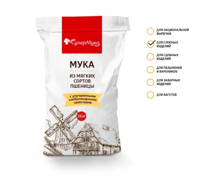 СуперМука для слоёных изделий предназначена для производства дрожжевого и без дрожжевого слоёного теста. В муке, предназначенной для этого вида теста, ключевыми являются следующие характеристики: